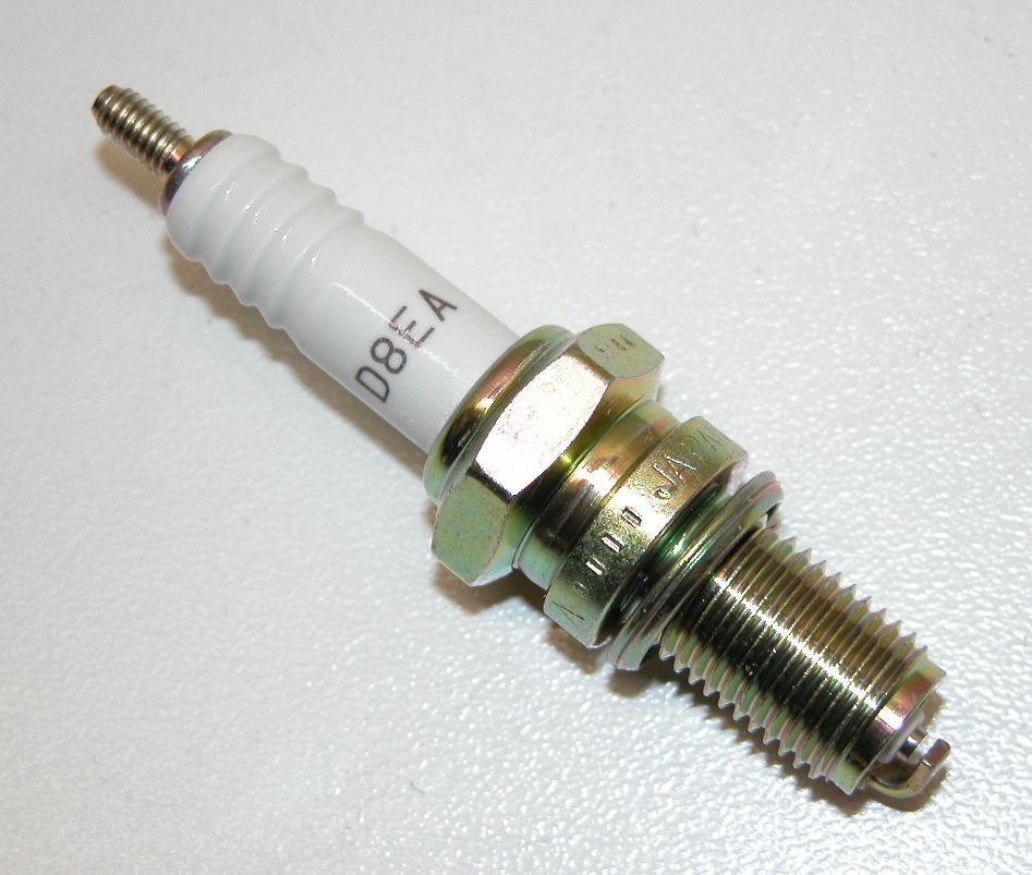 NGK-Zündkerze D8EA, für alle F650-Modelle Schlüsselweite:18,0 mm Gewindedurchmesser:12,0 mm Gewindelänge:19,0 mm Elektrodenabstand:0,7 mm Widerstand:nicht entstört