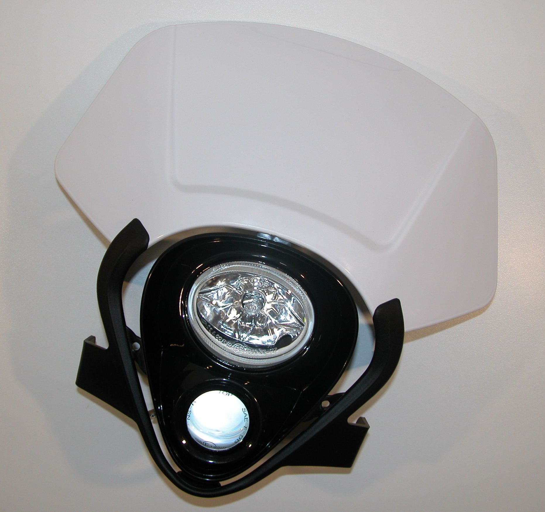 Universelle Lampenmaske die mit 4 Gummispannbändern an der Gabel befestigt wird. Der Schweinwerfer hat eine TÜV – Zulassung für den Straßenverkehr. Fern-, Abblend- und Standlicht. Dieser Artikel wurde schon mehrfach für unsere Umbauten benutzt.
